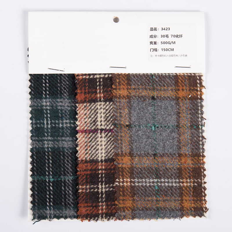 Klasszikus kockás gyapjú Tweed szövet ruházathoz télen A 3423 a klasszikus kockás mintázatot alkalmazza. Ez az elem hosszú múltra tekint vissza a divatiparban, és mindig megőrizte egyedi varázsát és státuszát. A finom szövési technológiának köszönhetően a kockás minta élénken jelenik meg az anyagon, amely nemcsak a hagyományos ruházat retro varázsát őrzi meg, hanem a modern dizájn egyszerűségét és divatját is magába foglalja, így az anyag vizuálisan rendkívül felismerhetővé és vonzóvá válik. Anyagát tekintve 3423 szövet 30% kiváló minőségű gyapjút választ fő anyagként. Természetes hőszigetelő anyagként a gyapjú jó higroszkópos és légáteresztő képességgel rendelkezik, amely hatékonyan rögzíti a testhőmérsékletet, és tartós meleget és kényelmet biztosít viselőjének. Ugyanakkor a gyapjú puha tapintása nagymértékben javítja az anyag bőrbarátságát és viselési élményét is. A szövet praktikusságának és tartósságának további fokozása érdekében a 3423-as szövet 70%-ban kiváló minőségű vegyi rost komponenseket tartalmaz. A vegyi szálas anyagok kiváló ránc- és kopásállóságukról ismertek, amelyek biztosítják, hogy az anyag lapos és ropogós maradjon a hosszú távú használat során, és ne legyen hajlamos deformációra vagy kopásra. Emellett a vegyi szálas anyagok könnyen kezelhető jellemzői az anyagot is könnyebben karbantarthatóvá és különféle mosási módokra alkalmassá teszik, ami nagymértékben meghosszabbítja a ruházat élettartamát.