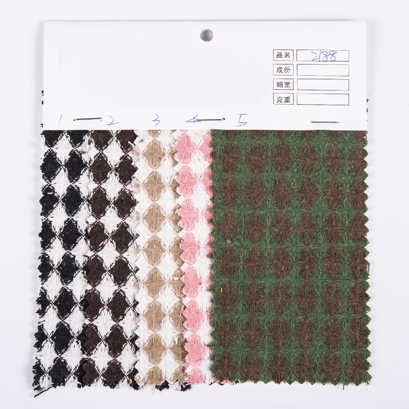 A Diamond Check Jacquard dombornyomott szövet 2188 egy professzionális szövet, amely 100% vegyi rostból készül. A szövet az egyedi gyémánt kockát használja központi dizájnelemként. A fejlett jacquard technológia révén ez a klasszikus minta pontosan szőtt az anyag felületén. Minden gyémánt csomópontot gondosan megmunkálnak, hogy biztosítsák a minta integritását és tisztaságát, ami nagyon magas szintű kivitelezést és részletszabályozást mutat. Ami az anyagválasztást illeti, a 2188-as szövet kiváló minőségű vegyi szálakat használ, hogy biztosítsa a szövet tartósságát, ráncállóságát és könnyű gondozását. Stabil fizikai és kémiai tulajdonságaival a kémiai szál jó méretstabilitást biztosít a szövetnek, és nem könnyen deformálódik vagy zsugorodik. Ugyanakkor a kémiai szálak kopásállósága és szakadásállósága is nagymértékben javítja a szövet élettartamát, így kiváló teljesítményt tud fenntartani különféle alkalmazási forgatókönyvekben. A kiváló jacquard technológia és a kiváló minőségű kémiai rostanyagok mellett a 2188 szövet dombornyomásos technológiát is alkalmaz, hogy tovább fokozza az anyag textúráját és vizuális hatását. A dombornyomásos technológia speciális kezelést végez az anyag felületén, hogy finom és rétegzett háromdimenziós hatást keltsen, fokozva az anyag tapintását és vizuális hatását. Ez az egyedi dombornyomott kialakítás nem csak javítja a szövet általános minőségét, hanem még vonzóbbá teszi a különböző dekorációs és ruházati alkalmazásokban.