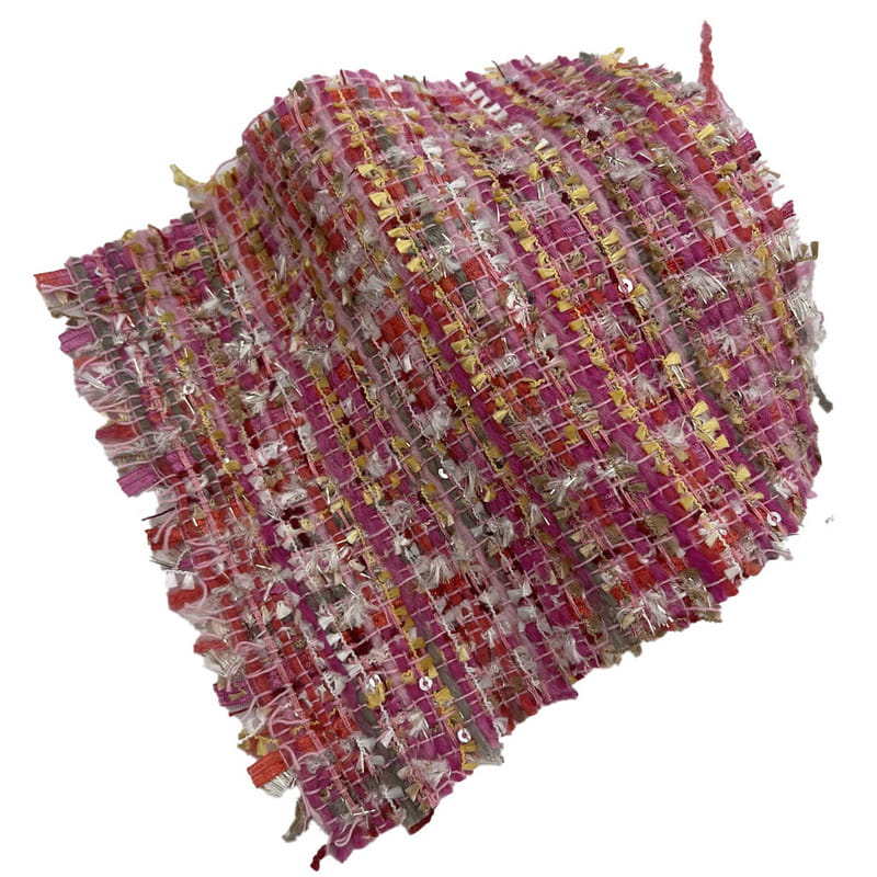 Ez a 21003 cikkszámú szövet tweed textil, amely 67% poliészterből és 33% akrilból áll. 385 g/m2-es területegységenkénti tömegével közepes súlyú szerkezetet képvisel. Az anyag vörös és rózsaszín flittereket tartalmaz fémes fonallal kombinálva, amelyeket a szövési folyamat során integráltak, hogy diszpergált fényvisszaverő felületet hozzanak létre. A poliészter alap szerkezeti stabilitást biztosít, míg az akril komponens hozzájárul a szövet domborulatához és textúrájához. Ez a kombináció változatos fényvisszaverő és felületi dimenziójú anyagot eredményez. Ezek a műszaki jellemzők teszik ezt a tweed-et olyan női ruhákhoz, ahol dekoratív elemekre és szerkezeti integritásra van szükség.