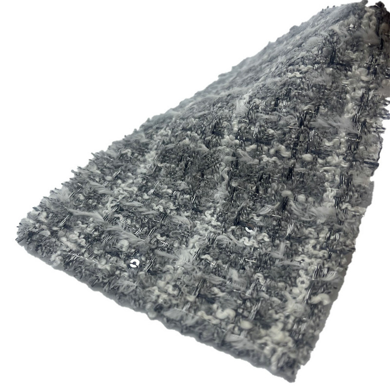 Ez a 23503. cikkszámú szövet egy tweed textil, amely 49% akrilból, 40% poliészterből, 7% gyapjúból és 4% nylonból áll. 335 g/m2-es területegységenkénti tömegével könnyű, mégis strukturált szerkezetet képvisel. A felület finom szürke kockás mintázattal rendelkezik, amelyet dombornyomással érnek el, amely finoman megemelt textúrát hoz létre az anyagon. Ez a technika növeli a pléd vizuális mélységét anélkül, hogy megváltoztatná a szövött alapot. A többszálas keverék egyesíti a poliészter stabilitását, az akril rugalmasságát, a gyapjú természetes tapintását és a nejlon tartósságát. Ezek a tulajdonságok alkalmassá teszik az anyagot olyan női ruhákhoz, ahol részletes mintázat és tapintható érdeklődés szükséges.