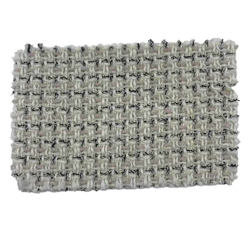Ez a 23523-as cikkszámú anyag egy tweed textil, amely 78% poliészterből, 12% gyapjúból és 10% pamutból áll. 440 g/m2 felületi tömegével közepes súlyú, ruhákhoz is alkalmas konstrukciót képvisel. A világos rózsaszín alapon a szövés során fémes fonallal integrált kockás minta található. Ez a kombináció kontrasztot teremt mind a vizuális megjelenésben, mind a fényvisszaverődésben. A poliészter, gyapjú és pamut keveréke hozzájárul a szövet méretstabilitásához, hőszabályozásához és nedvességkezeléséhez. Ezek a műszaki jellemzők teszik ezt a tweed-et olyan divatruhákhoz, ahol a minta meghatározása és az anyagteljesítmény szükséges.