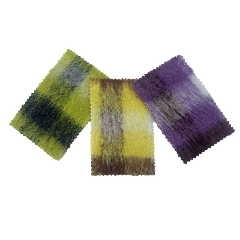 Ez a 3256. cikkszámú szövet egy tweed textil, amely 20% gyapjúból és 80% egyéb szálakból áll. 700 g/m területegységenkénti tömegével nehéz szerkezetet képvisel. A lila felületet kockás mintázat jellemzi, amely hosszú bolyhos textúrával van beépítve, így speciális szövési és befejező folyamatok révén összetett szerkezet jön létre. Ez a gyártási technika megnövelt szálhosszúságot eredményez a felületen, ami kifejezett háromdimenziós hatást eredményez. A gyapjúkeverék összetétele hozzájárul a szövet hőszigetelő tulajdonságaihoz és szerkezeti rugalmasságához. Ezek a műszaki jellemzők jelentős térfogatú és felületmélységű anyagot eredményeznek, így alkalmazható olyan fedőbevonatokhoz, ahol fokozott melegség és textúra szükséges.