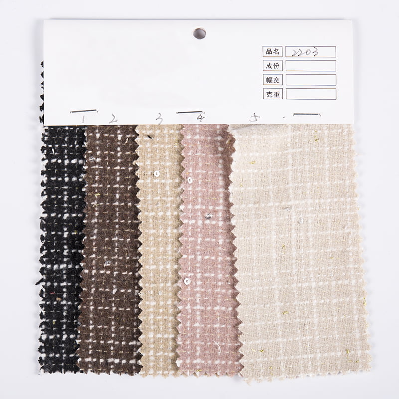 A Sequins Check Plaid Tweed Fabric 2203 egy kiváló minőségű, 100%-ban vegyi rostból készült szövet termék. A fejlett textiltechnológiának köszönhetően ez a szövet tökéletesen ötvözi a vegyi szál tartósságát, ráncállóságát és könnyen kezelhető tulajdonságait, biztosítva, hogy a szövet megőrizze eredeti formáját és textúráját hosszú távú használat és gyakori mosás után is. A szövet fő jellemzője az egyedi flitteres kockás kialakításban rejlik. A flitteres elemek egyenletesen oszlanak el a szövet felületén egy finom berakási eljárás révén, ami nem csak javítja a szövet vizuális rétegzettségét, hanem finom és visszafogott fényes hatást is mutat a fény alatt, egyedi kiemelést adva az anyagnak. ruházat. A kockás minta klasszikus színillesztést és elrendezést alkalmaz, amely nemcsak a tweed szövet retro varázsát őrzi meg, hanem magában foglalja a modern dizájn egyszerűségét és hangulatát is, így az anyag többféle alkalomra is elegáns és stílusos megjelenést kölcsönöz. A textúráját tekintve a flitteres 2203-as kockás tweed szövet a tweed szövési eljárásával gazdag háromdimenziós érzetet és finom tapintást kölcsönöz az anyagnak. A vegyi szálak kiválasztása puhává és kényelmessé teszi az anyagot, miközben jó légáteresztő képességgel és kopásállósággal rendelkezik, így biztosítva, hogy viselője a kényelmet és a kényelmet élvezze, miközben élvezi a divat szépségét. A flitteres kockás tweed 2203 szövet szintén rendkívül nagy plaszticitással és alkalmazhatósággal rendelkezik. Függetlenül attól, hogy csúcskategóriás, személyre szabott divathoz vagy a mindennapi viselethez használt kiegészítőkhöz használják, az anyag tökéletesen illeszkedik a különböző tervezési stílusokhoz és szabási követelményekhez, különböző divatos varázsokat mutatva meg.