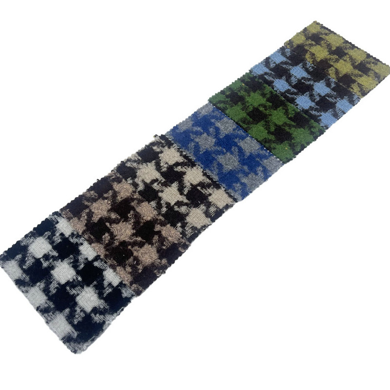 Ez a 2882-es cikkként megjelölt szövet egy jacquard tweed textil, amely 10% gyapjúból és 90% egyéb szálakból áll. 600 g/m területegységenkénti tömegével nehéz szerkezetet képvisel. A felület a jacquard szövési folyamat révén a vadászfog mintát ötvözi a kockás elemekkel. Ecseteléssel domborított mackószerű textúrát hoztak létre, sűrű, rövid bolyhos felületet alkotva. Ez a technika megváltoztatja az anyag vizuális mélységét és tapintási tulajdonságait, miközben megőrzi a szőtt minták geometriai pontosságát. A gyapjúkeverék összetétele hozzájárul az anyag rugalmasságához és hőszigeteléséhez. Ezek a műszaki jellemzők teszik ezt a szövetet olyan projektekben alkalmazhatóvá, amelyek összetett mintameghatározást és jellegzetes felületi textúrát igényelnek.