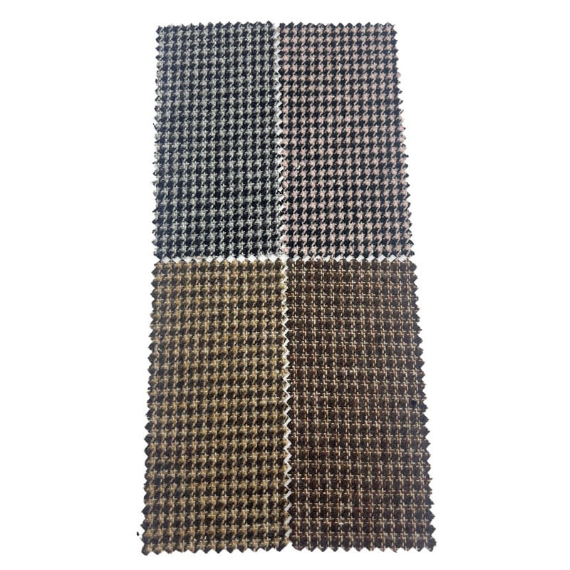 Ez a 4334-es cikkszámú szövet egy szőtt tweed textil, amely 35% gyapjúból és 65% egyéb szálakból áll. 450 g/m területegységre eső tömegével közepes súlyú szerkezetet képvisel. A felület a vadászfog mintát kockás elemekkel ötvözi, így precíz szövési technikákkal kompozit geometriai mintát alkot. Ez az építési módszer egymásba illeszkedő törött kockákat hoz létre meghatározott színkontraszttal az egész szöveten. A gyapjúkeverék összetétele hozzájárul a szövet méretstabilitásához és ráncállóságához. Ezek a műszaki jellemzők bonyolult mintatagolású és szerkezeti tartósságú anyagot eredményeznek, így alkalmazható olyan nadrágokhoz, ahol részletes mintázat és hosszú távú teljesítmény szükséges.